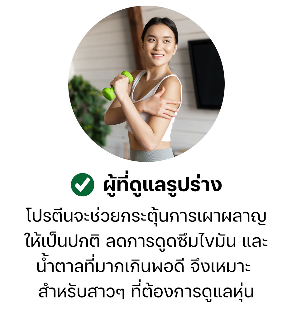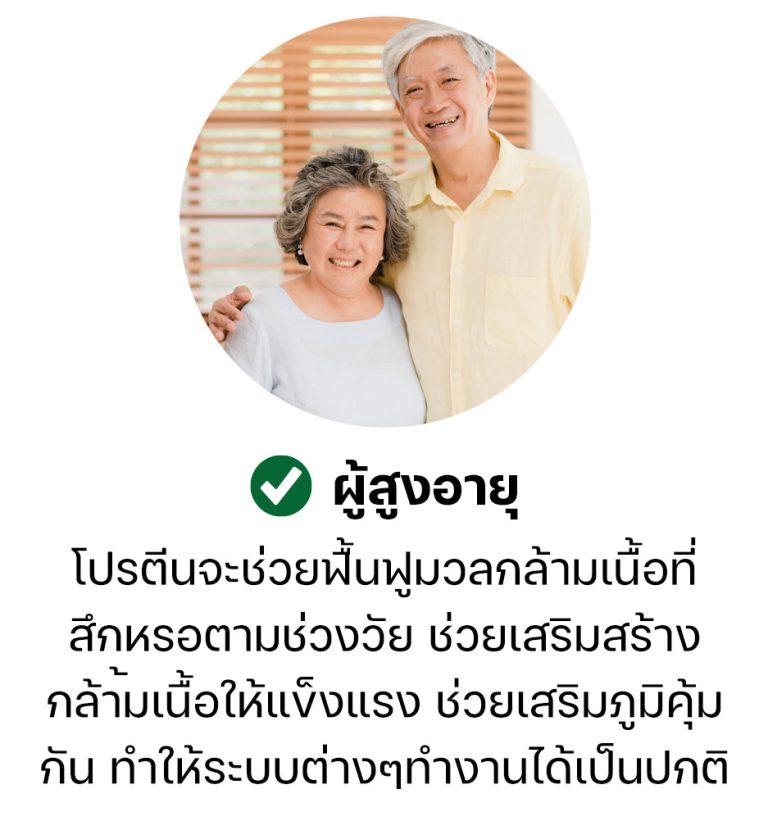 ผู้สูงวัย ควรรับประทาน “โปรตีนจากพืช” เช่น โปรตีนถั่วเหลือง หรือมัลติแพลนท์ โปรตีน เพราะเป็นโปรตีนจากธรรมชาติ ปลอดภัย ดูดซึมเร็ว และย่อยง่าย รวมถึงมีวิตามิน และแร่ธาตุต่างๆ