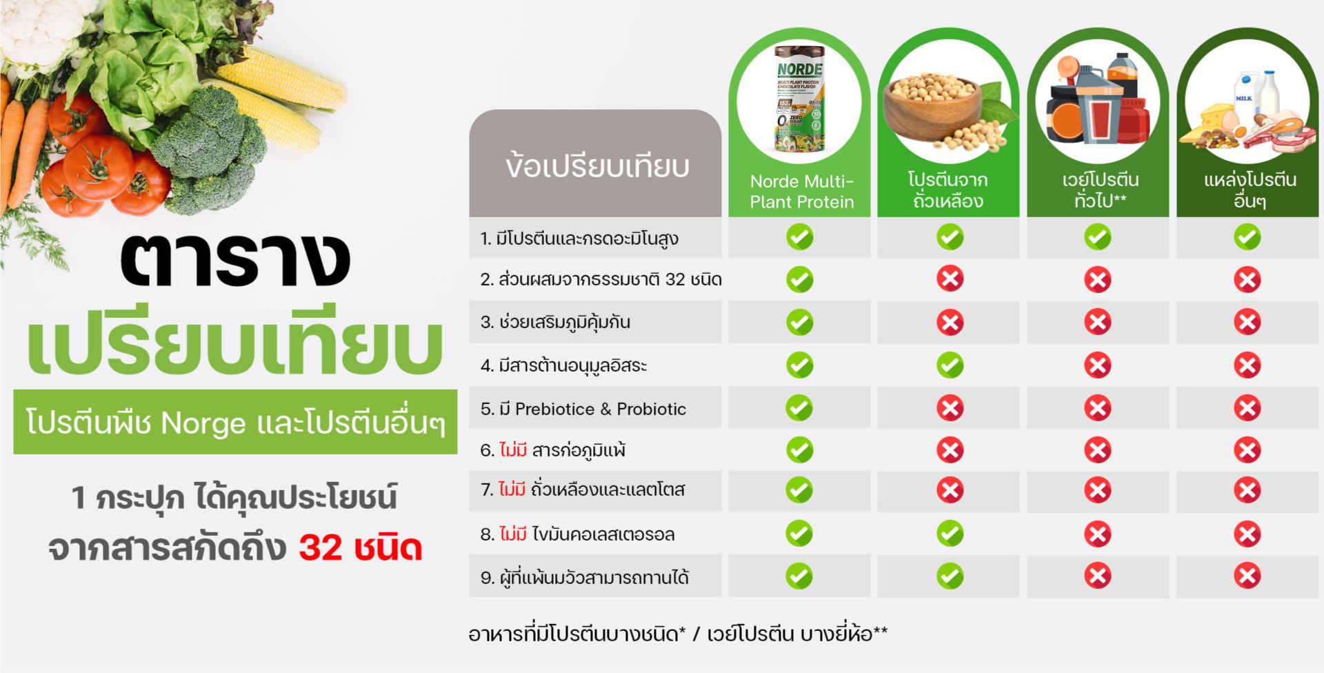 โปรตีนทางเลือกใหม่ สำหรับคนแพ้นม แพ้แลคโตส แพ้ถั่วเหลือง เลือกใช้โปรตีนสะอาด ที่สกัดจากพืช 100% ไม่ว่าจะเป็น ถั่วลันเตา, ถั่วเขียว, เมล็ดฟักทอง, เมล็ดทานตะวัน และ อะโวคาโด (Avocado) นอกจากนี้ยังอุดมไปด้วยวิตามิน แร่ธาตุ และสารสกัดจากธรรมชาติรวม 32 ชนิด Norge Multi Plant Protein ช่วยซ่อมแซม ฟื้นฟู และเสริมสร้างมวลกล้ามเนื้อ เสริมสร้างภูมิคุ้มกัน และเพื่อความแข็งแกร่งให้กับร่างกาย